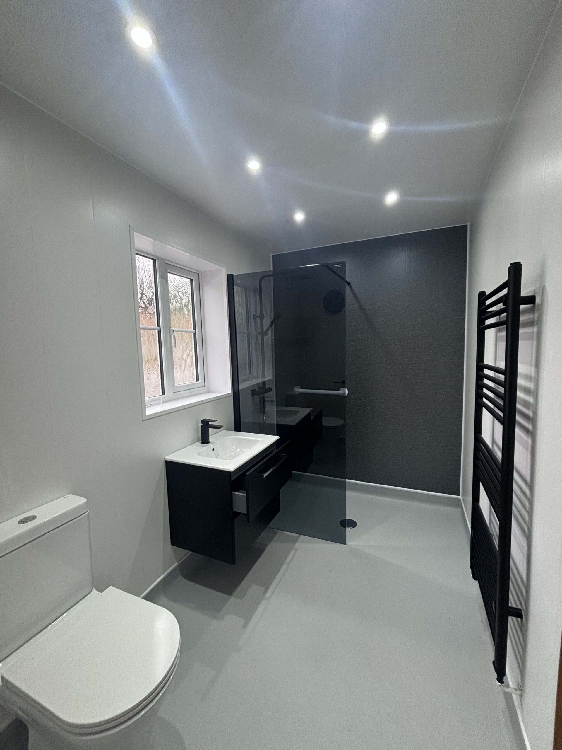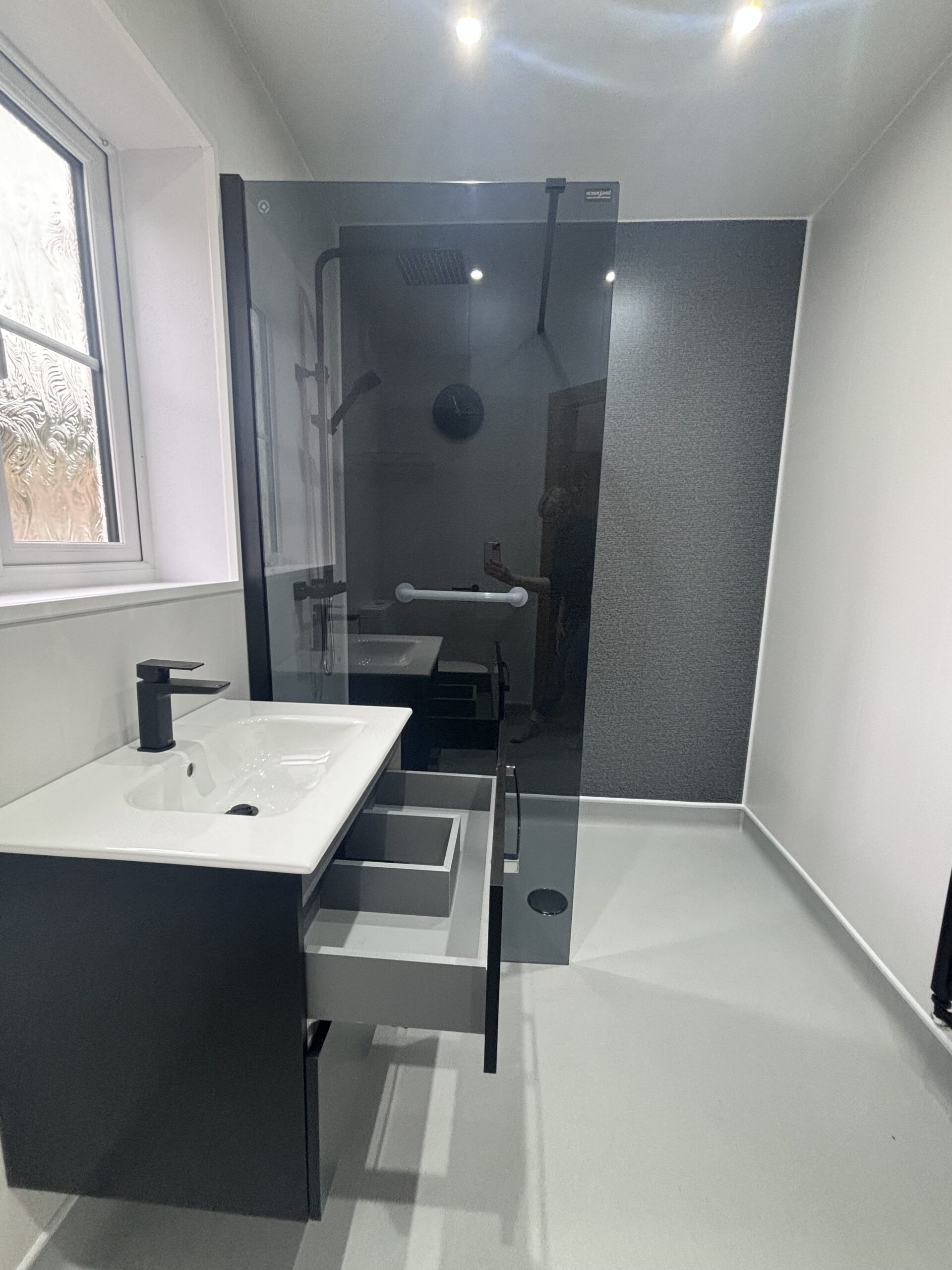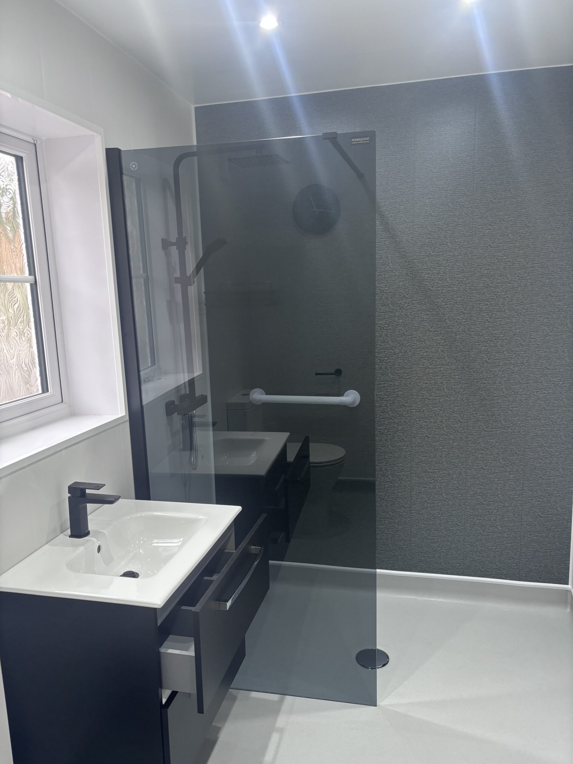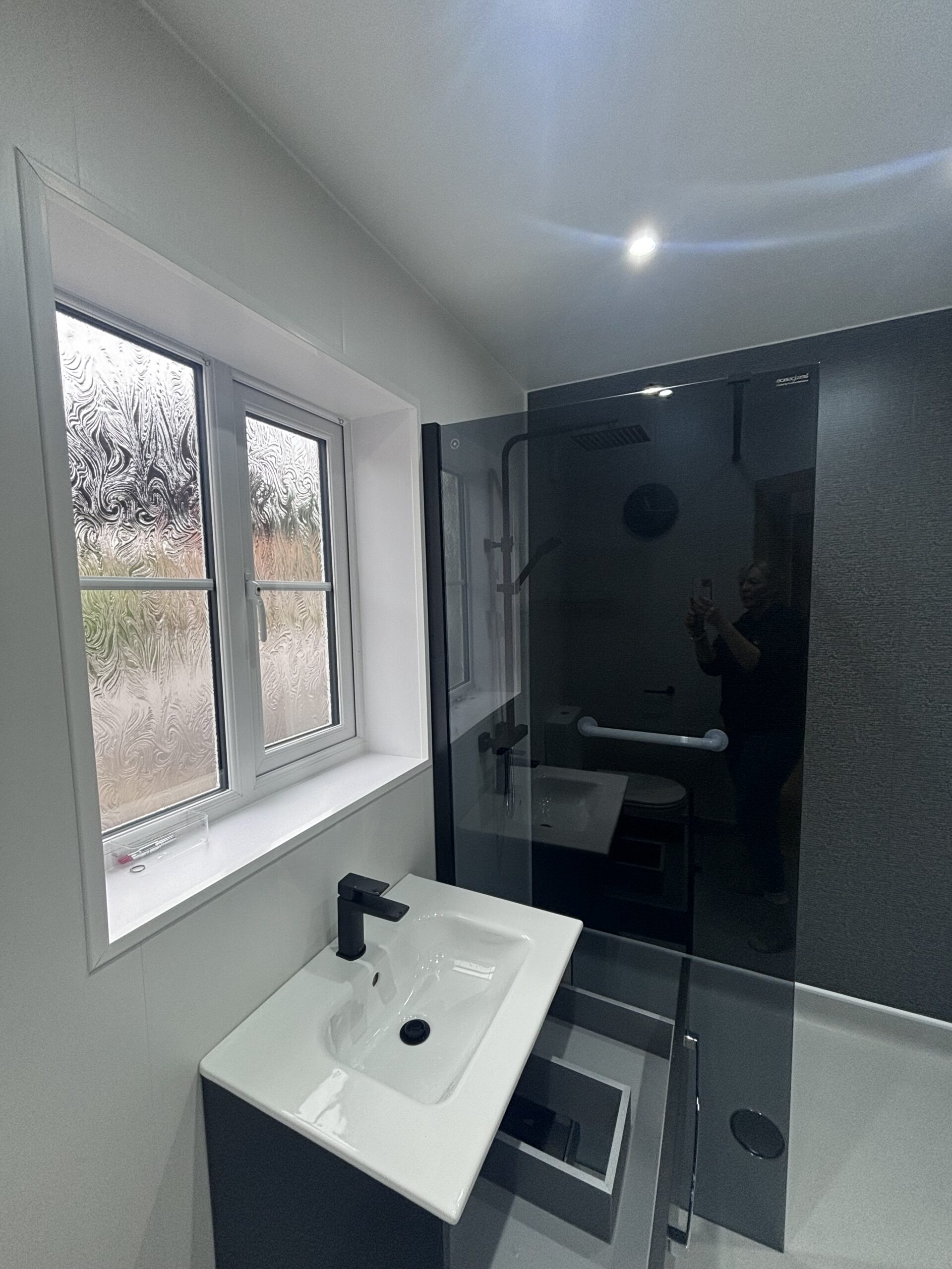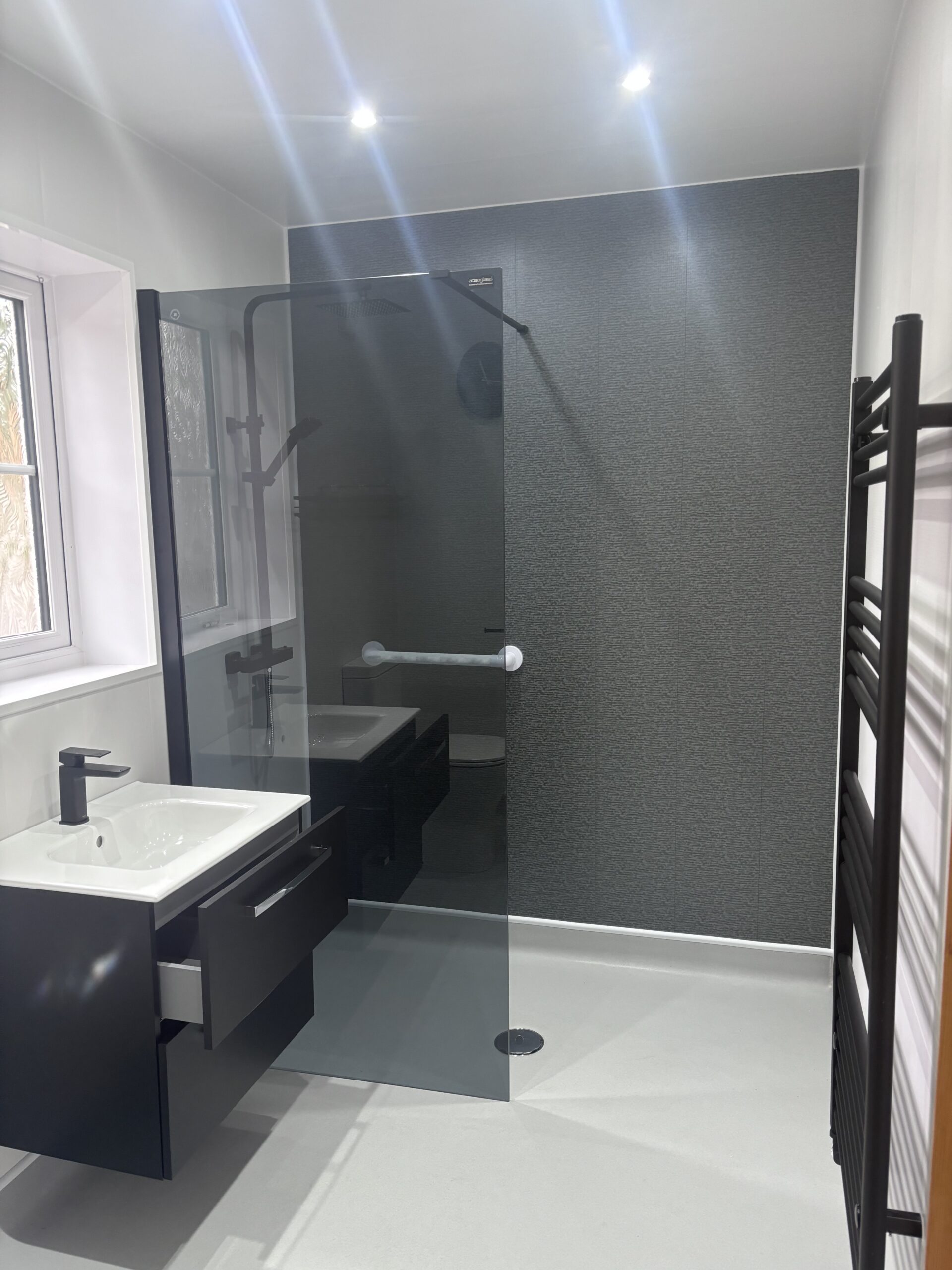 Wet wall paneling in Dark Anthracite Mosaic for the Shower Wall with White Mosaic across the rest of the bathroom