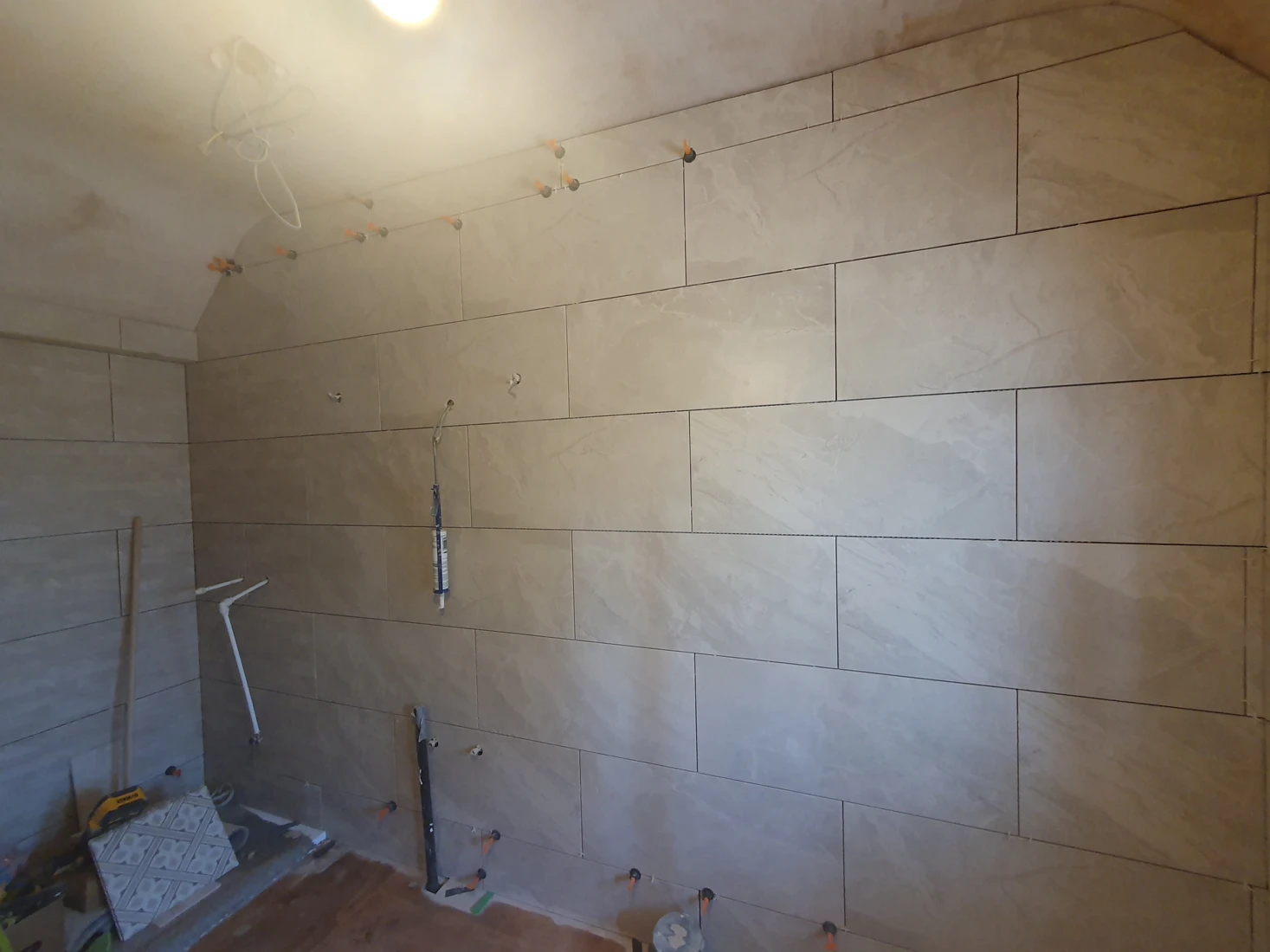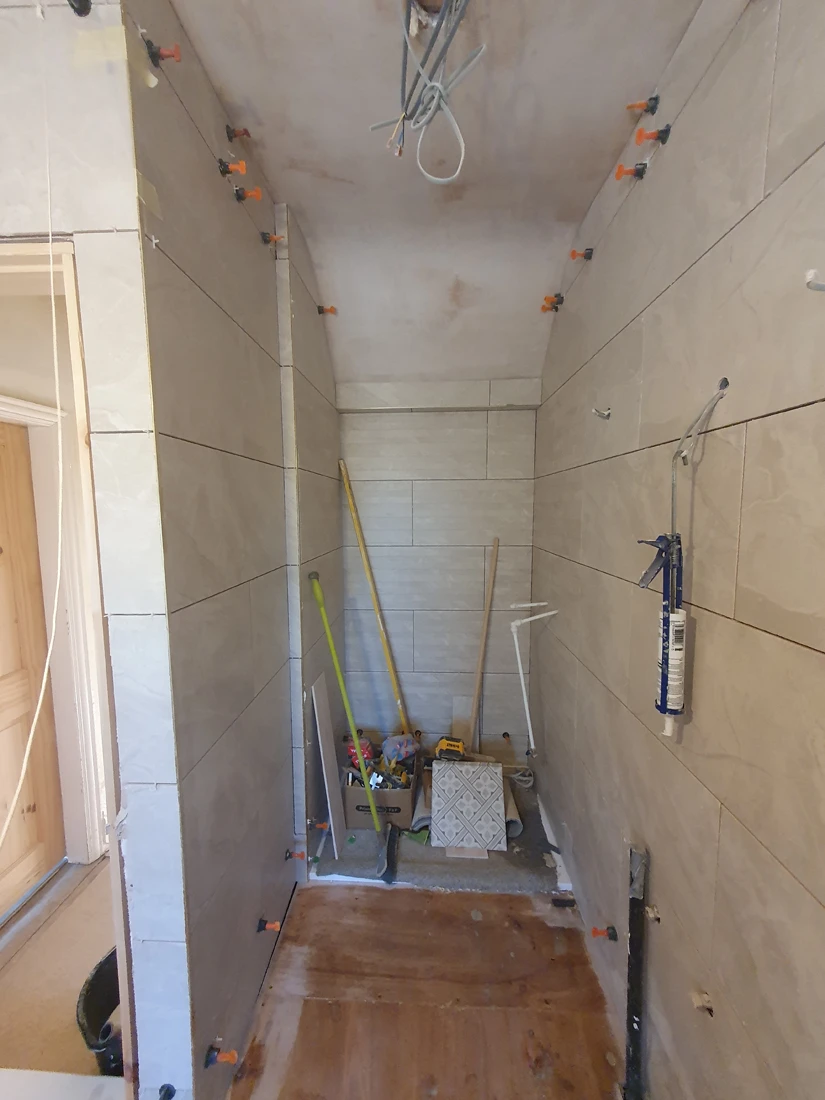 Tying the whole room together with Tiles from MKM Home; the flooring is Mr Jones in beige and ERSA cream and decor for the walls.